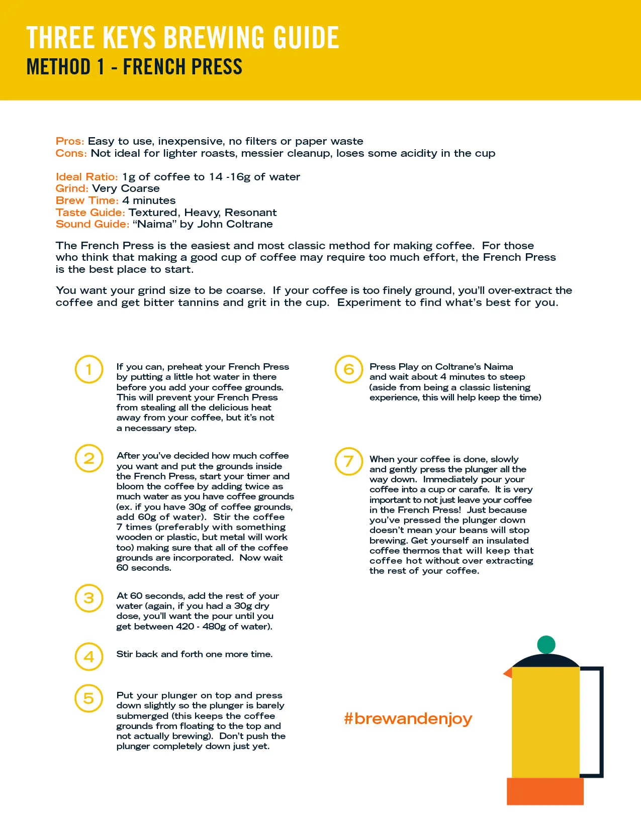 Lastly, I did some light copy work on each page based on the sound guide recommendation for each brewing method, which was a really fun way to give the assets some of that vibrant Three Keys personality and flair. The combination of the copy with the illustrations brings some levity and brightness to the page, reminding you that it’s all about having fun and vibing off the flavors and notes. Time to press play and brew!
